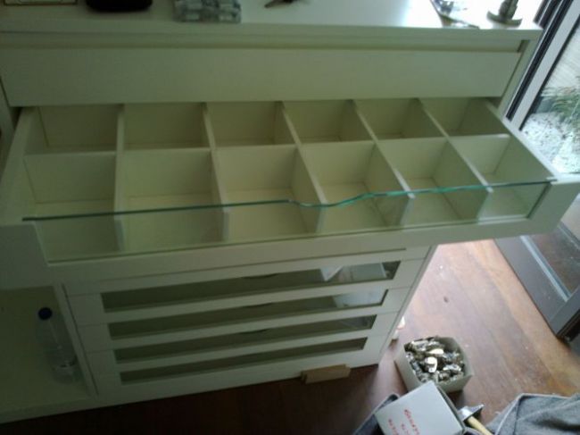 Armario realizado a medida en color blanco cajones con frontal de cristal. Cuenta con un cajón con divisiones para prendas pequeñas